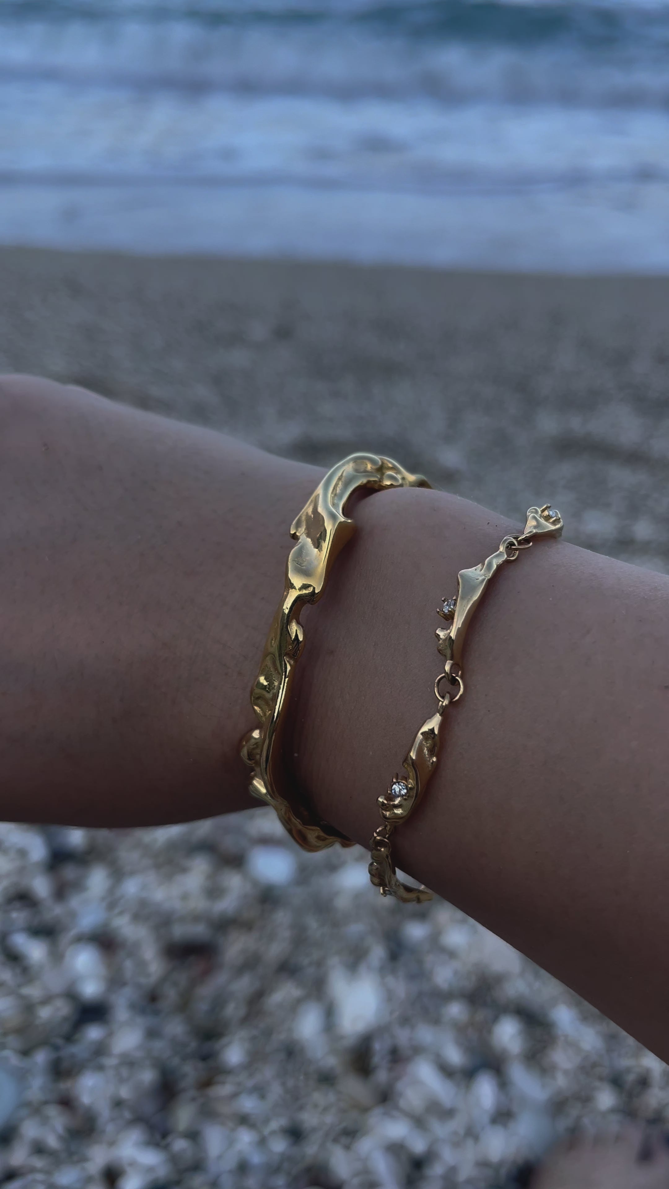 Bransoletka inspirowana falami i morzem, z nieregularną formą, która oddaje naturalny ruch wody. Delikatnie zdobiona białymi cyrkoniami, zatrzymuje piękno oceanu w eleganckiej, pozłacanej 18-karatowym złotem oprawie.